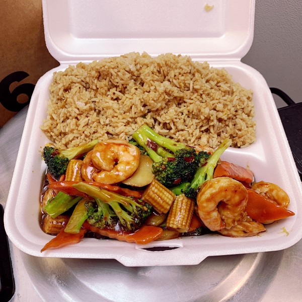 Beef, chicken, shrimp, and mixed veg. in brown sauce