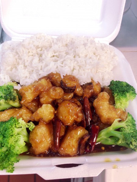 Beef, chicken, shrimp, peanuts, and fresh veg. in spicy Kung Pao sauce