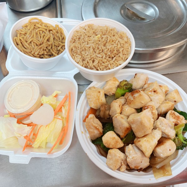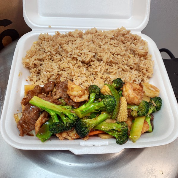 Beef, chicken, shrimp, and mixed veg. in garlic sauce